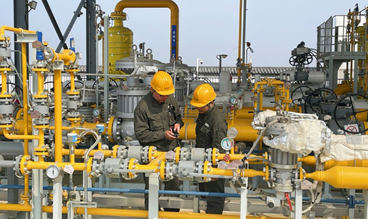 图为该电厂发电部集控运行主值班员正对电厂调压站天然气管道进行泄漏检测作业。