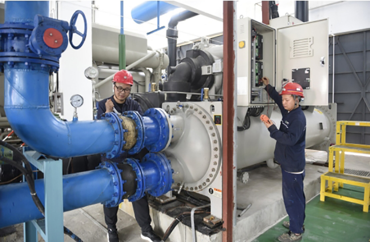 图为该矿供电队制冷降温班职工在对地面制冷车间设备进行检修维护。