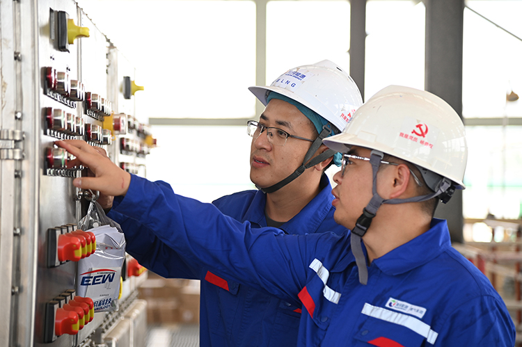图为该事业部党员在接收站BOG高压压缩机现场检查控制仪表安装情况。(张艺馨 摄)