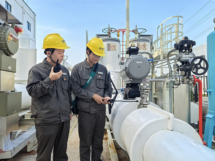 图为该公司运行人员正执行前置模块天然气系统的查漏工作。 (吴越 摄)